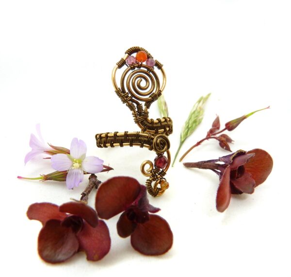 Chaque fil est minutieusement courbé et tressé à la main pour réaliser le corps de la bague. Pour y parvenir, j’utilise une ancienne technique d’artisanat dénommée « Wire wrapping« . Je peux ainsi créer des bijoux uniques et résistants, sans utiliser ni colle ni soudure. Les fils que j’utilise dans mes tressages sont par ailleurs tous recouverts d’un vernis protecteur. Ce vernis permet de limiter l’oxydation naturelle des métaux. Il assure ainsi une meilleure longévité du brillant de votre bijou en conservant le bel éclat du cuivre et du laiton.